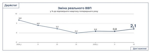 Згідно з даними Державної служби статистики, оприлюдненими у середу, 10 грудня, на офіційному сайті, у третьому кварталі 2025 року реальний валовий внутрішній продукт (ВВП) України зріс на 2,1% порівняно з аналогічним періодом 2024 року. Для порівняння, у другому та першому кварталах цього ж року ВВП зростав на 0,8% і 0,9% відповідно. Також зазначено, що у порівнянні з попереднім кварталом, з урахуванням сезонного фактору, реальний ВВП за третій квартал зріс на 0,8%. У другому кварталі цей показник становив 0,2%.