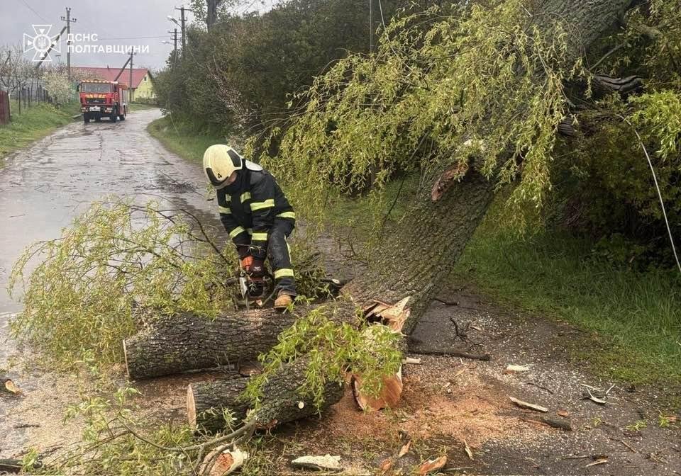 За інформацією ГУ ДСНС Полтавщини, внаслідок шквального вітру зафіксовано значні порушення електропостачання, численні випадки падіння дерев і пошкодження конструкцій.